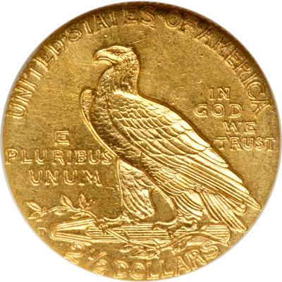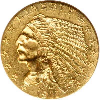1911-D $2.50 Indian. NGC graded MS-61. Mostly untoned. Key date. Only 55,680 minted. This boldly struck and brilliant gold example exhibits good definition on Indian's features and feathers. The obverse luster is moderately frosty, while the frosted eagle creates a pleasing effect on the reverse as well. Both sides have a few wispy marks, but these are fewer in number and severity than is usual for an '11-D in MS61 grade. Light golden toning graces a few areas. No notable marks on either side, while the mintmark is clearly impressed by the dies (the most valuable state of preservation). The combination of rarity, quality, deep strike and low mintage is formidable in the short-lived Indian head quarter eagle series. The present piece is worthy of a place in a BU set (PCGS # 7943) .