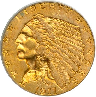 1911-D is the key date in the 15 coin Indian head series. Indeed, Denver Mint struck only three dates within the series, 1914-D and 1925-D being the other two. The obverse portrays Brule Lakota Chief Hollow Horn Bear, who had taken part in Theodore Roosevelt's inaugural parade, March 4, 1905. The Chief died March 15, 1913, according to the notice in the April 1913 Numismatist, which misidentified him as the model for the 1899 $5 Silver Certificates. His true identity as Boston sculptor Bela Lyon Pratt's model for the 1908 Quarter Eagles and half eagles first came to light in an exhibit in the 1988 ANA Convention (PCGS # 7943) .