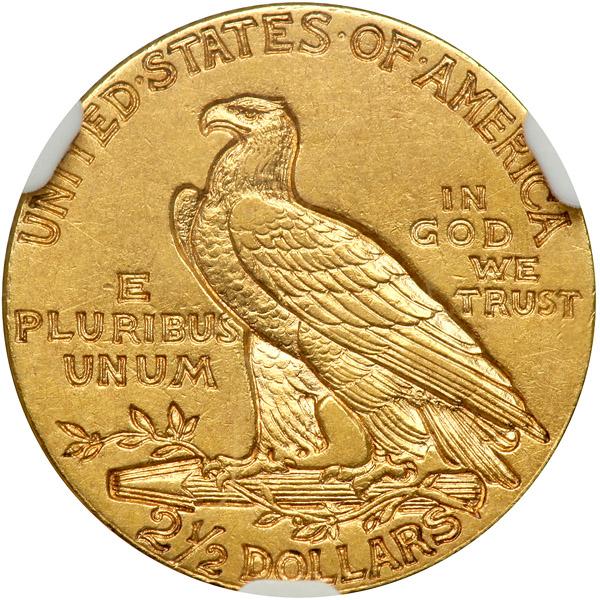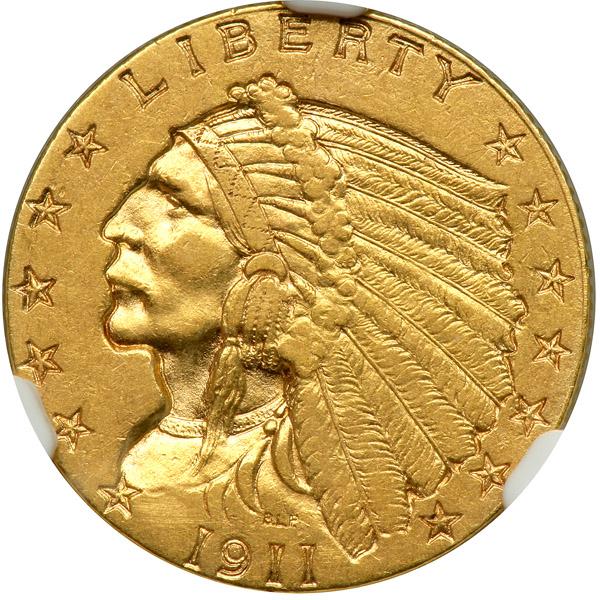 1911-D. Weak D. NGC graded AU-55. The lowest mintage year in the set of 15 Indian Quarter Eagles, with only 55,680 made. Often, as here, the mintmark is impressed lightly by the dies, but is still visible with or without the aid of a magnifying glass. Pop 70; 31 finer (PCGS # 7954) .