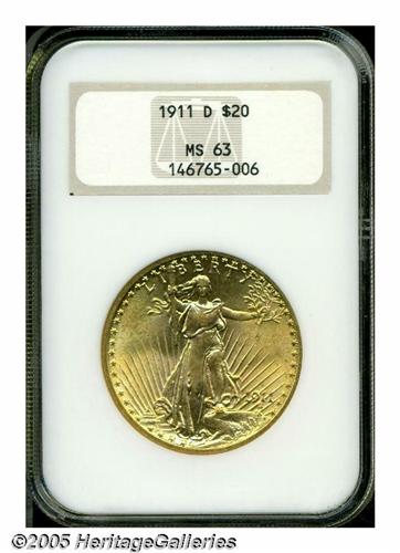 <B>1911-D<$20> MS63 NGC.</B></I> Well struck and fully lustrous, with beautiful coloration and minimally marked surfaces that have a pleasing, grainy, matte-like texture.