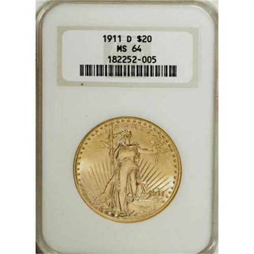 <B>1911-D $20 MS64 NGC.</B></I> NGC Census: (3076/2228). PCGS Population (2700/1950). Mintage: 846,500. Numismedia Wsl. Price for NGC/PCGS coin in MS64: $845. (#9158)<BR><BR><B>Coin Engraver:</B> Augustus Saint-Gaudens<BR><BR><b>Shipping:</b> Coins & Currency (<a target="_blank" href="http://www.heritageauctions.com/common/shipping.php">view shipping information</a>)