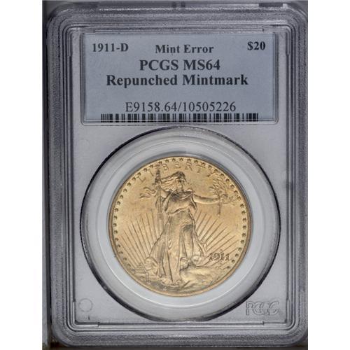 <B>1911-D $20 MS64 PCGS.</B></I> FS-1911.5, Breen-7383. The mintmark is clearly repunched to the east. A well struck yellow-gold near-Gem that would make a novel addition to a date set.<BR><BR><b>Shipping:</b> Coin/Currency (<a target="_blank" href="http://www.heritageauctions.com/common/shipping.php">view shipping information</a>)