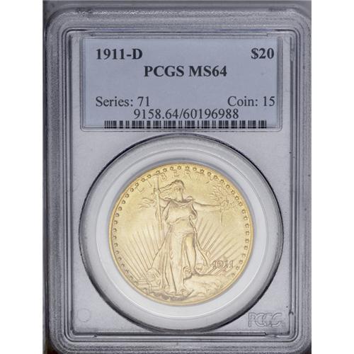 <B>1911-D<$20> MS64 PCGS.</B></I> FS-1911.5. The mintmark is nicely repunched east. A lovely olive-gold Choice double eagle with vibrant cartwheel sheen and unblemished fields. Small marks are localized to Liberty's upper left leg.