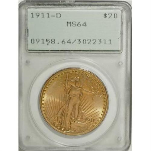 <B>1911-D $20 MS64 PCGS.</B></I> Orange toning fills the interiors, although the borders provide olive tints. Well struck and vibrantly lustrous. In a first generation holder.<BR><BR><B>Coin Engraver:</B> Augustus Saint-Gaudens<BR><BR><b>Shipping:</b> Coins & Currency (<a target="_blank" href="http://www.heritageauctions.com/common/shipping.php">view shipping information</a>)