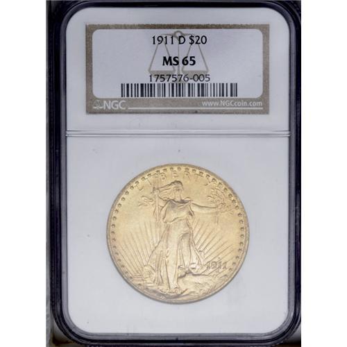 <B>1911-D<$20> MS65 NGC.</B></I> A second lovely Gem example of this generally well produced issue. This example offers satiny and lustrous orange-gold surfaces, an excellent strike, and few mentionable abrasions, even under a loupe.