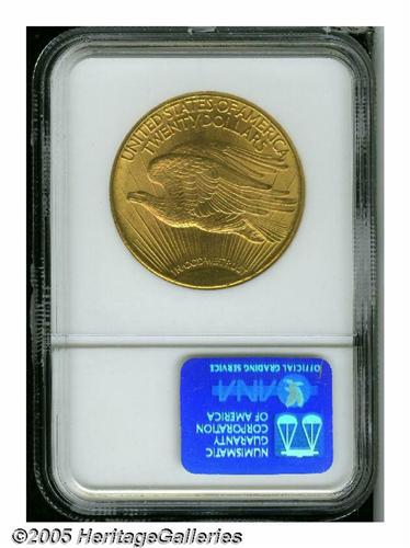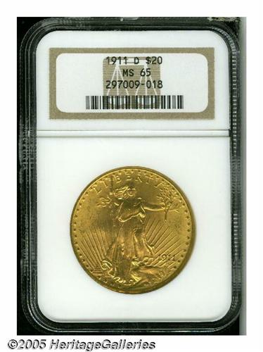 <B>1911-D<$20> MS65 NGC.</B></I> Radiant luster emanates from greenish-gold surfaces that have a matte-like texture. The design features are sharply struck, with excellent definition apparent on Liberty's face and the Capitol Building. The surfaces are well preserved on both sides. The '11-D is one of the most common issues of the entire series. It is available in quantity in all Mint State grades up to and including MS64, and becomes somewhat scarce in higher grades.