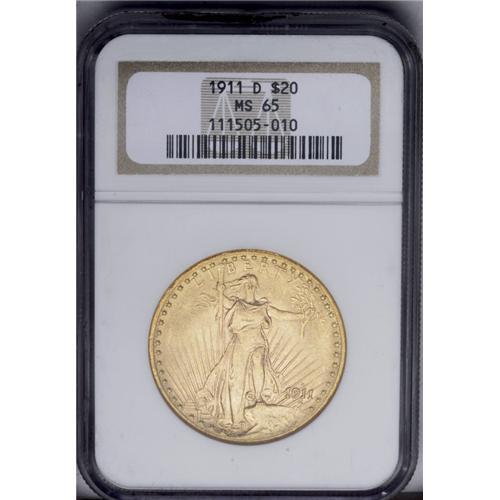 <B>1911-D<$20> MS65 NGC.</B></I> Sharply struck with strong satin-like luster over the matte-like surfaces. One of the more common mintmarked Saints from this decade, but seldom found with this degree of eye appeal.