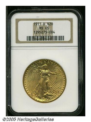 <B>1911-D<$20> MS65 NGC.</B></I> The characteristic matte-like surfaces are wonderfully preserved for the issue and entirely draped in a warm, reddish patina.