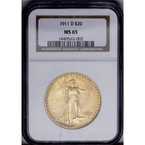 <B>1911-D<$20> MS65 NGC.</B></I> The striking definition is especially noteworthy on this Gem. The lustrous surfaces also display light and darker orange-gold coloration. A pleasing example and unquestionably original.