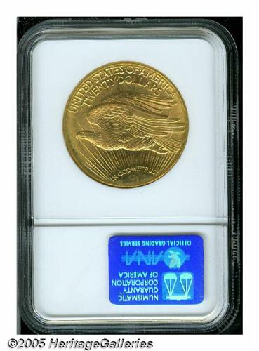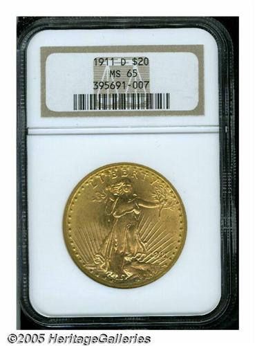 <B>1911-D<$20> MS65 NGC.</B></I> This is a fully lustrous Gem that will please the connoisseur. The surfaces are exceptional, the design sharp, and the color outstanding. This is a relatively common date, although from a modest mintage of 846,500 coins.