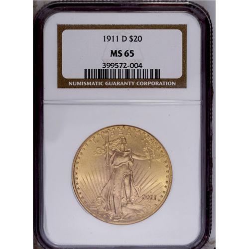 <B>1911-D<$20> MS65 NGC.</B></I> Well struck with clean fields that are pebbly in appearance and give the piece a shimmering luster. A perfect candidate for a high-end type set.