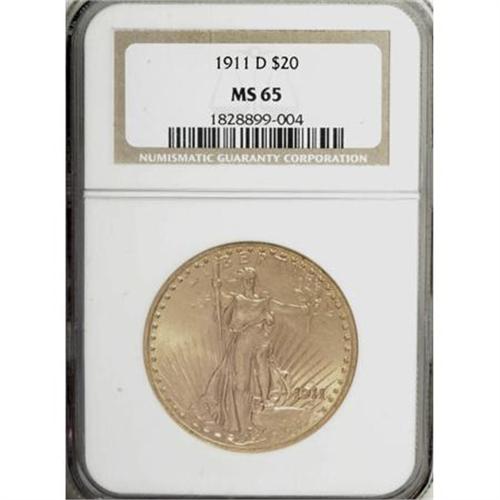 <B>1911-D $20 MS65 NGC.</B></I> Well struck with lovely satin luster and a pleasingly smooth, unmarked appearance across both sides. The fields have an attractive, distinctly matte-like texture on both sides. Surface marks are nearly nonexistent. <BR><BR><B>Coin Engraver:</B> Augustus Saint-Gaudens<BR><BR><b>Shipping:</b> Coins & Currency (<a target="_blank" href="http://www.heritageauctions.com/common/shipping.php">view shipping information</a>)