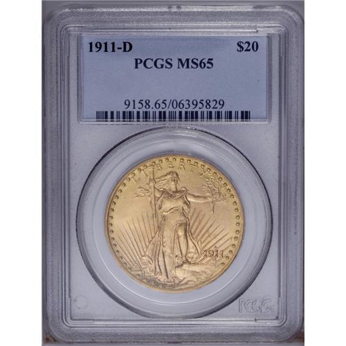 <B>1911-D<$20> MS65 PCGS.</B></I> The strike is penetrating on the Capitol building and the eagle, and the obverse in particular is beautifully preserved. A couple of unobtrusive marks are noted on the eagle.