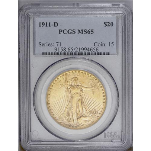 <B>1911-D $20 MS65 PCGS.</B></I> The surfaces are slightly matte textured and luster is radiant. Few marks adorn the central motifs which makes this piece a particularly attractive example for the type collector.