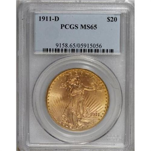 <B>1911-D $20 MS65 PCGS.</B></I> PCGS Population (1467/428). NGC Census: (1713/495). Mintage: 846,500. Numismedia Wsl. Price for NGC/PCGS coin in MS65: $1,300. (#9158)<BR><BR><B>Coin Engraver:</B> Augustus Saint-Gaudens<BR><BR><b>Shipping:</b> Coins & Currency (<a target="_blank" href="http://www.heritageauctions.com/common/shipping.php">view shipping information</a>)