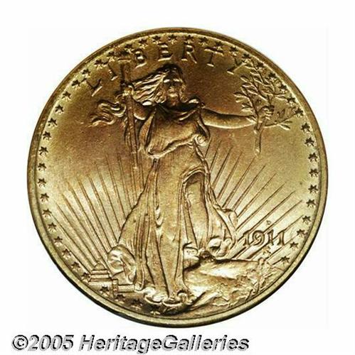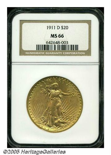 <B>1911-D<$20> MS66 NGC.</B></I> A spectacular Gem example virtually as nice as the day it was minted. Brilliant and lustrous. Most design features are sharp. A common issue in the MS60 to 63 grade range, but "very scarce" in Gem-quality condition as attested by David Akers. The 1911-D is highly sought by type collectors and Denver Mint specialists.