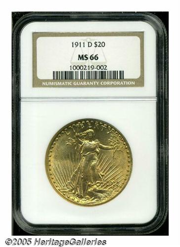 <B>1911-D<$20> MS66 NGC.</B></I> Matte-like surfaces emit vibrant luster overlaid by soft, apricot-gold patina. Sharply struck and minimally abraded. A very attractive Double Eagle.