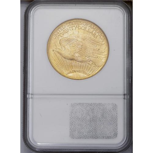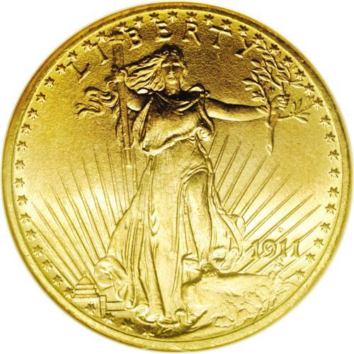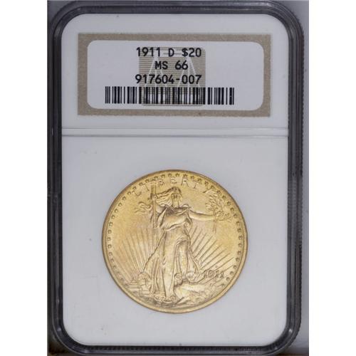 <B>1911-D<$20> MS66 NGC.</B></I> The otherwise readily obtainable 1911-D is a significant condition rarity above the MS65 grade level. Among the smoothest survivors available to today's specialists, this coin is also uncommonly well defined for the type. Continuous frosty luster and subtle orange-gold color further enhance the eye appeal of this impressive Gem.