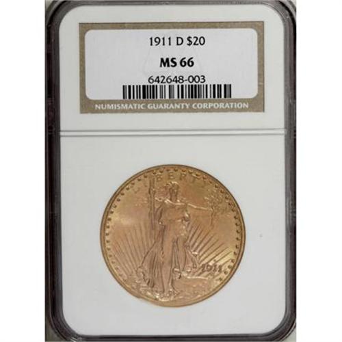 <B>1911-D $20 MS66 NGC.</B></I> A spectacular Premium Gem example, virtually as nice as the day it was minted. Brilliant and lustrous. Most design features are sharp. A common issue in the MS60 to 63 grade range, but "very scarce" in Gem condition as attested by David Akers. The 1911-D is highly sought by type collectors and Denver Mint specialists. <BR><BR><B>Coin Engraver:</B> Augustus Saint-Gaudens<BR><BR><b>Shipping:</b> Coins & Currency (<a target="_blank" href="http://www.heritageauctions.com/common/shipping.php">view shipping information</a>\)