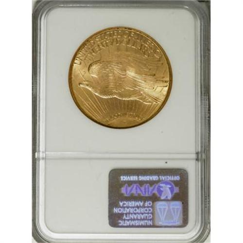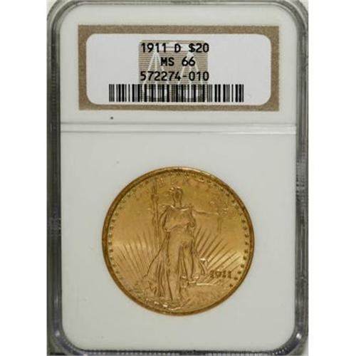<B>1911-D $20 MS66 NGC.</B></I> Well struck with lovely, satiny, grainy-textured surfaces that display soft copper-golden colorations with subtle green highlights near the peripheries. Other than a diagonal mark above the eagle's head, the radiantly lustrous surfaces are free of distracting blemishes. An uncommonly vibrant and attractive Premium Gem.<BR><BR><B>Coin Engraver:</B> Augustus Saint-Gaudens<BR><BR><b>Shipping:</b> Coins & Currency (<a target="_blank" href="http://www.heritageauctions.com/common/shipping.php">view shipping information</a>)