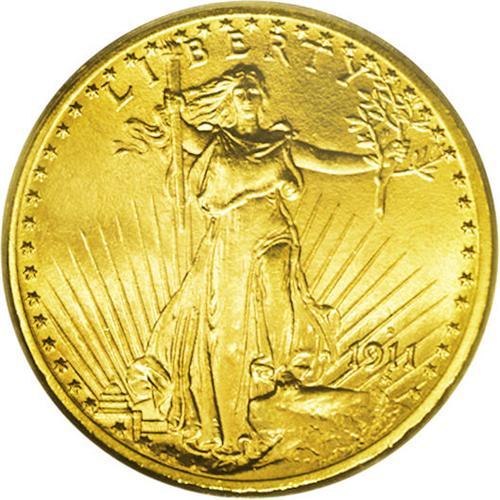 <B>1911-D<$20> MS66 PCGS.</B></I> A phenomenally beautiful coin, one that is fortunately available in high Mint State grades. The present example sports superlative peach-gold coloration, complementing the coruscating luster, fine-grained, mattelike surfaces, minimal contact marks, and robust eye appeal. Together, NGC and PCGS have graded 36 pieces finer (9/06), but this piece is certainly top-end of the surviving population in terms of aesthetics.