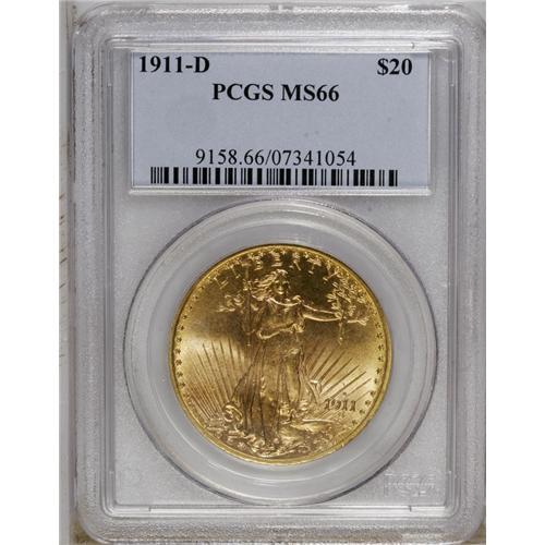 1911-D $20 MS66 PCGS. A phenomenally beautiful coin, o