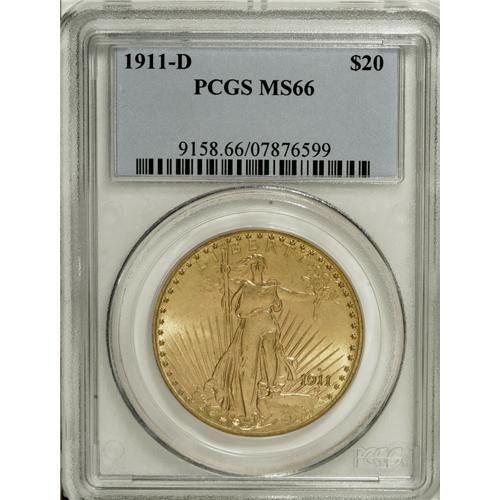 <B>1911-D $20 MS66 PCGS.</B></I> Both Denver and San Francisco had much larger double eagle mintages than did Philadelphia in 1911, though the main Mint would be the only producer of that denomination the next year. This Premium Gem has attractive, subtly lustrous yellow-orange surfaces that display a hint of mint-green at the margins. Well struck with clean devices and minimal ticks in the fields. PCGS has awarded just nine coins a higher grade (3/07).<BR><BR><b>Shipping:</b> Coins & Currency (<a target="_blank" href="http://www.heritageauctions.com/common/shipping.php">view shipping information</a>)
