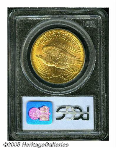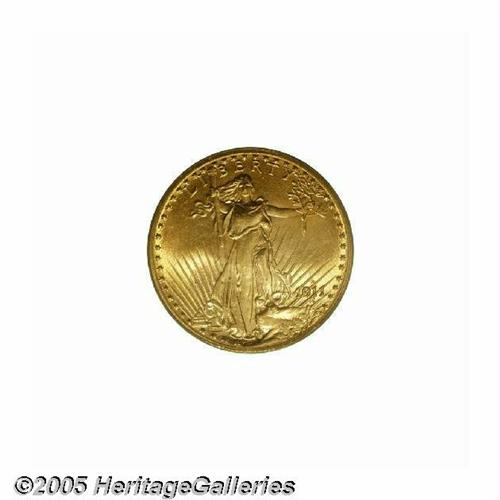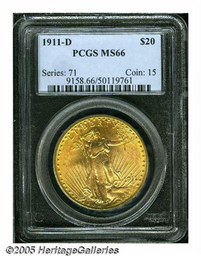 <B>1911-D<$20> MS66 PCGS.</B></I> Fully struck with pleasing matte-like surfaces and showing a rich red-orange patina over both sides. A pair of tiny contact marks reside between TY and Liberty's shoulder, on the upper right obverse. Otherwise, the piece seems exquisitely preserved and virtually pristine. A frosty, highly lustrous Premium Gem, with a sheer abundance of stunning visual appeal. Just nine pieces have been certified at a finer grade level, by PCGS (6/05).