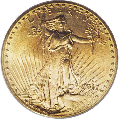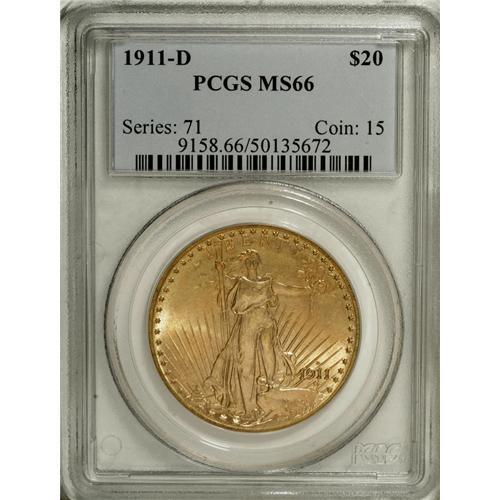 <B>1911-D $20 MS66 PCGS.</B></I> Glowing luster radiates from peach-gold and mint-green surfaces that display a pleasing grainy finish. The obviously powerful strike has delivered bold definition to the design features, including the panes of the Capitol building, Liberty's face, fingers, and toes, and the eagle's plumage. Both sides are lovingly preserved. While Premium Gem specimens are fairly available, it is unlikely that many would match the aesthetic appeal and technical quality of the present example.<BR><BR><b>Shipping:</b> Coins & Currency (<a target="_blank" href="http://www.heritageauctions.com/common/shipping.php">view shipping information</a>)