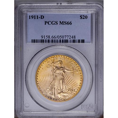 <B>1911-D<$20> MS66 PCGS.</B></I> The 1911-D is one of the commonest dates in the series. In Premium Gem, the grade of the coin in this lot, fewer than 750 examples have been certified by PCGS and NGC. Pebbly-like surfaces exhibit nice luster and alternating apricot and yellow-gold patina. Sharply struck devices reveal strong detail on Liberty's face, fingers, and toes, though portions of the Capitol building are soft. An inoffensive linear abrasion on Liberty's forehead, a few small rim marks, and a small spot on the reverse border are all mentioned for accuracy.