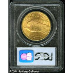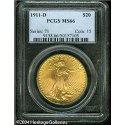 1911-D $20 MS66 PCGS. The otherwise readily obtain <B>1911-D $20 MS66 PCGS.</B></I> The otherwise readily obtainable 1911-D is a significant condition rarity above the MS65 grade level. Among the smoothest survivors available to today's specialists, this coin is also uncommonly well defined for the type. Continuous frosty luster and original orange-gold color further enhance the eye appeal of this impressive Gem. <BR><BR><B>Important notice:</B> Heritage usually auctions material at the rate of 200-250 lots per hour. On some occasions eBay Live bid software or the Internet may not be able to keep up with the pace of the auction. We recommend placing a realistic absentee bid now as insurance to avoid disappointment. Occasionally the auctioneer may eliminate or reject an eBay Live bid, and the auctioneer may also reopen a lot after the close of the eBay live bidding (usually because we missed an audience bid), and may reject your bid even if it shows you as the winning bidder. By bidding via eBay Live, you agree that Heritage may award the lot to another bidder at its sole discretion under the circumstances described above or any other reasonable circumstances. Since eBay bids are not shown to us until we open the lot on the floor, we treat those bids just like floor bids. In most cases the floor responds before the eBay bid is presented to us, due to Internet lag time, so for consistency we have made it a policy that floor bids are always considered first over tie eBay live bids. Also please note that all Heritage lots purchased through eBay Live carry a 20% Buyer's Premium. Please make sure you read the Terms and Conditions before you bid. This lot is being auctioned in conjunction with a live floor auction by Heritage Galleries & Auctioneers. All final auction and invoice information will be supplied by Heritage Galleries & Auctioneers, and all other information should be considered preliminary. Lot:7125