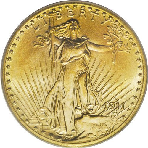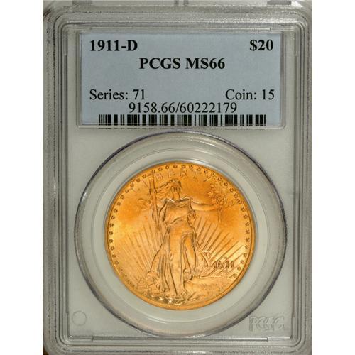 <B>1911-D $20 MS66 PCGS.</B></I> This example is a frosty and highly lustrous Gem with attractive lemon-yellow and deeper orange color. The surfaces are especially vibrant for the issue and uncommonly smooth, with only a small, out-of-the-way scrape on the eagle's wing being worthy of mention.<BR><BR><b>Shipping:</b> Coin/Currency (<a target="_blank" href="http://www.heritageauctions.com/common/shipping.php">view shipping information</a>)