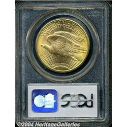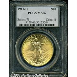 <B>1911-D<$20> MS66 PCGS.</B></I> Extremely sharp striking details bestow a solid foundation for this impressive premium Gem, for grading purposes. Add full satin luster that sparkles over the fine-grain, matte-like surface textures, and near-impeccable preservation, along with lovely even coloration, and the result is a truly splendid, solidly graded piece that should bring a premium price at auction. Few 1911-D's can match this exquisite coin in terms of either technical merit or visual appeal. <BR><BR><B>Important notice:</B> Heritage usually auctions material at the rate of 200-250 lots per hour. On some occasions eBay Live bid software or the Internet may not be able to keep up with the pace of the auction. We recommend placing a realistic absentee bid now as insurance to avoid disappointment. Occasionally the auctioneer may eliminate or reject an eBay Live bid, and the auctioneer may also reopen a lot after the close of the eBay live bidding (usually because we missed an audience bid), and may reject your bid even if it shows you as the winning bidder. By bidding via eBay Live, you agree that Heritage may award the lot to another bidder at its sole discretion under the circumstances described above or any other reasonable circumstances. Since eBay bids are not shown to us until we open the lot on the floor, we treat those bids just like floor bids. In most cases the floor responds before the eBay bid is presented to us, due to Internet lag time, so for consistency we have made it a policy that floor bids are always considered first over tie eBay live bids. Also please note that all Heritage lots purchased through eBay Live carry a 20% Buyer's Premium. Please make sure you read the Terms and Conditions before you bid. </span></font></tr></table></td></tr></table>