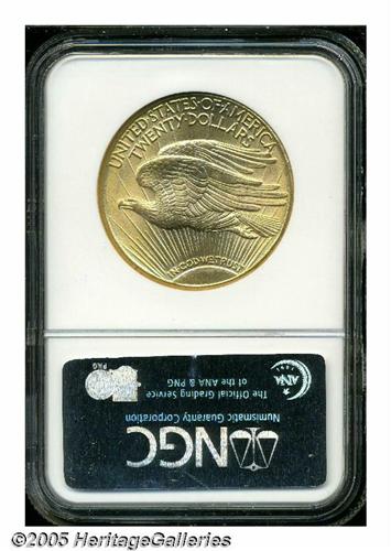 <B>1911-D<$20> MS67 NGC.</B></I> After the 1908 No Motto, the 1911-D (846,500 pieces produced) is the most common pre-1920 Saint-Gaudens Double Eagle from an absolute standpoint. Also in terms of total number of coins known, the '11-D is one of the most readily obtainable dates in the entire 1907-1933 series. David Akers further notes that "a small number of superb, nearly perfect examples of this issue are known to exist." As one might suspect, however, such coins are rare and infrequently offered at auction. This is one of the finest representatives of this issue that we have offered. Both sides display a smooth sheen from rim to rim that would be remarkable for a Double Eagle of any type or date. The surfaces are bursting with mint luster that possesses the characteristic light granularity of the issue. There is not a single ill-defined feature on either side, and the eye appeal is truly amazing. NGC and PCGS combined report 29 coins at the MS67 level, and none are finer (6/05).