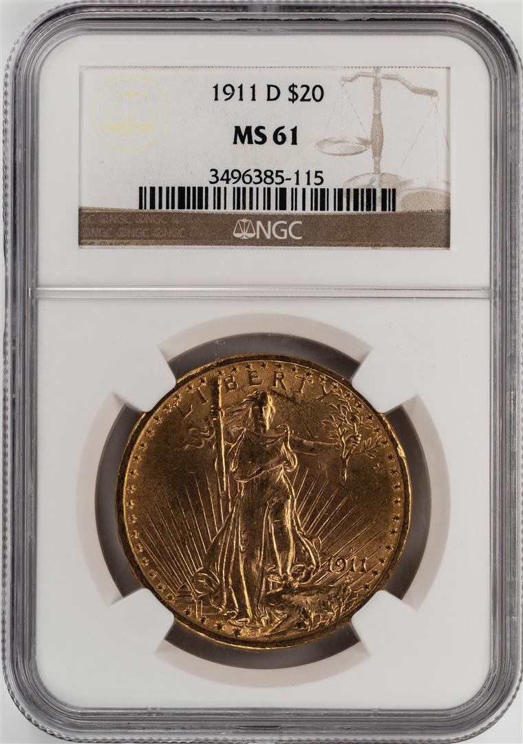 One 1911-D $20 St. Gaudens Double Eagle Gold Coin NGC MS61. NGC Certified.