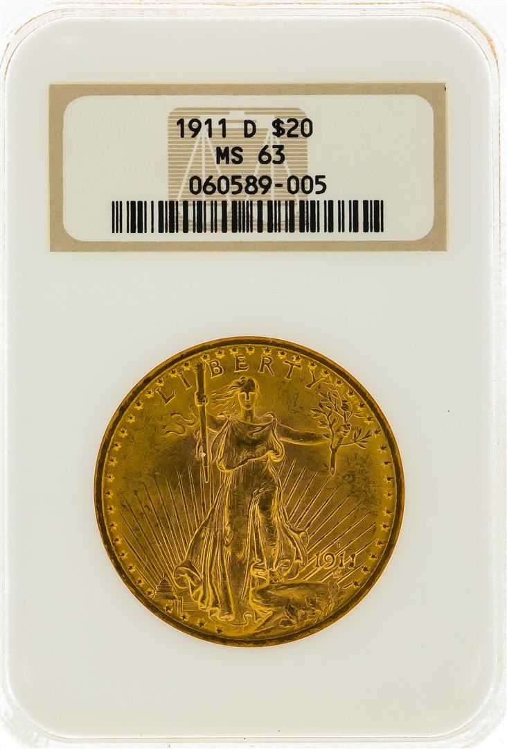 One 1911-D $20 St. Gaudens Double Eagle Gold Coin NGC MS63. NGC Certified.