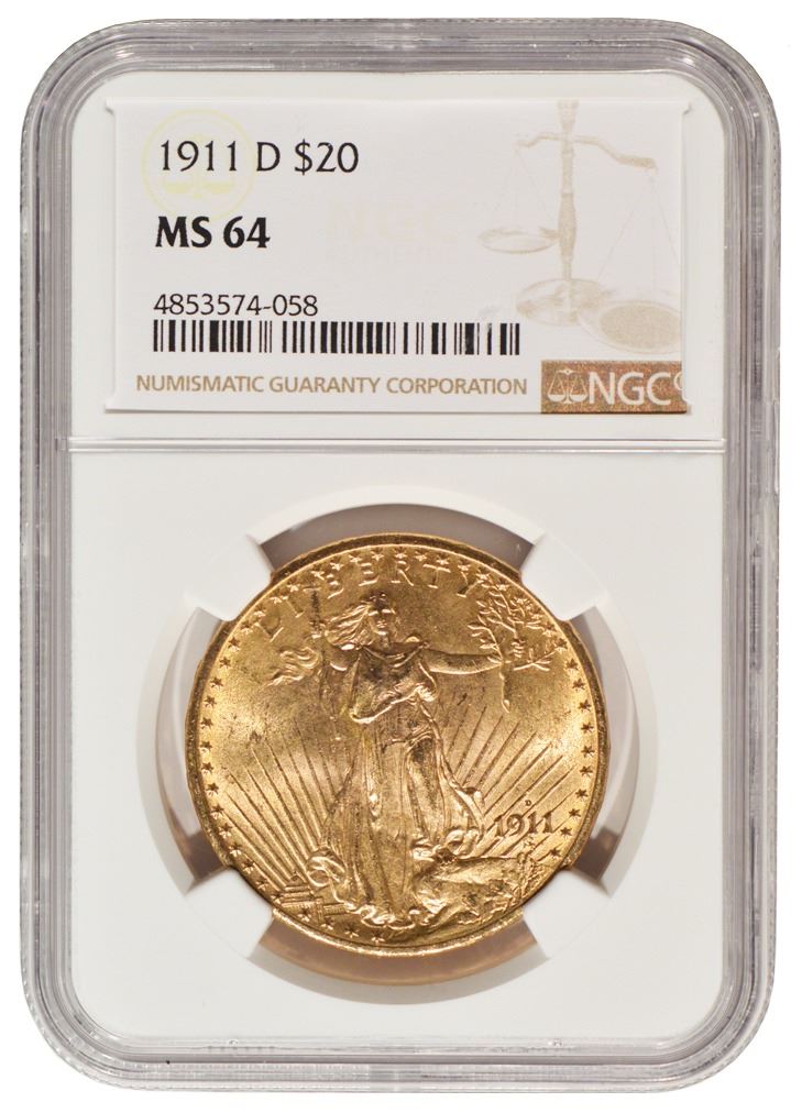 One 1911-D $20 St Gaudens Double Eagle Gold Coin NGC MS64.
