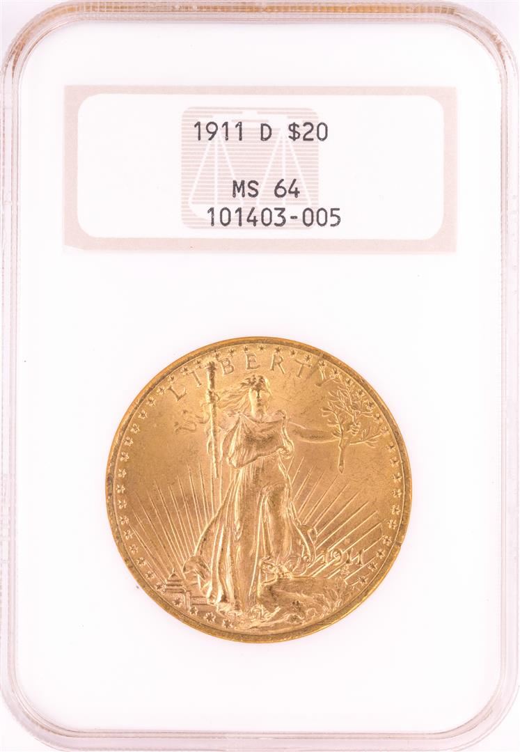 One 1911-D $20 St. Gaudens Double Eagle Gold Coin NGC MS64. NGC Certified.