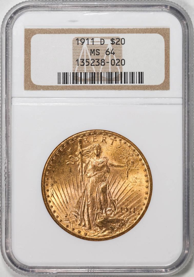 One 1911-D $20 St. Gaudens Double Eagle Gold Coin NGC MS64. NGC Certified.
