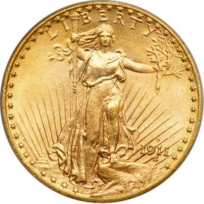 1911-D $20 St. Gaudens. PCGS graded MS-64. Mostly untoned. This exceptionally pleasing MS64 example has rich luster over each side with subtle accents of toning at the edge. A well-struck example, it boasts good details. Furthermore, the coin has no bothersome abrasions or points of wear (PCGS # 9158) .