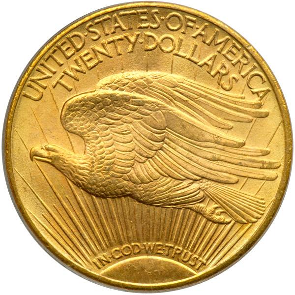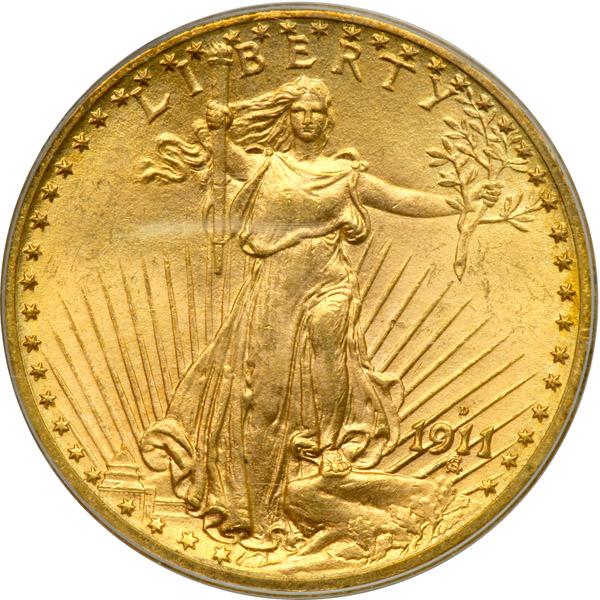 1911-D $20 St. Gaudens. PCGS graded MS-65. Housed in an Old Green Holder. Nice light golden toning. Boldly struck. Well struck with smooth, velvety luster, familiar to all who know the look of '11-D, and rich scintillating color. A great deal of discussion also surrounds a coin's strike. This Denver Mint release has excellent detail with no sign of weakness to the face, knee, toes, Capitol building or eagle (PCGS # 9158) .