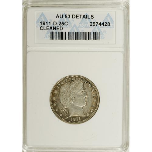 <B>1911-D 25C --Cleaned--ANACS. AU53 Details.</B></I> NGC Census: (0/108). PCGS Population (3/52). Mintage: 933,600. Numismedia Wsl. Price for NGC/PCGS coin in AU53: $433. (#5660)<BR><BR><b>Shipping:</b> Coins & Currency (<a target="_blank" href="http://www.heritageauctions.com/common/shipping.php">view shipping information</a>)