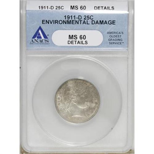 <B>1911-D 25C --Environmental Damage--ANACS MS60 Details.</B></I> NGC Census: (0/43). PCGS Population (1/42). Mintage: 933,600. Numismedia Wsl. Price for NGC/PCGS coin in MS60: $555. (#5660)<BR><BR><B>Coin Engraver:</B> Charles E. Barber<BR><BR><b>Shipping:</b> Coins & Currency (<a target="_blank" href="http://www.heritageauctions.com/common/shipping.php">view shipping information</a>)