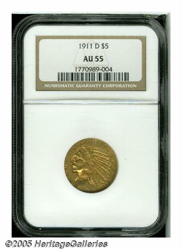 <B>1911-D<$5> AU55 NGC.</B></I> Softly struck and lightly worn, with muted luster and khaki-gold coloration enhanced by reddish overtones. A few minor marks are evident in the reverse fields. Just 72,500 half eagles of this issue were struck, the second lowest mintage in the entire series.