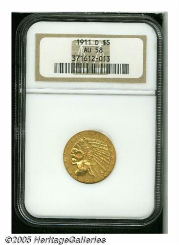 1911-D $5 AU58 NGC. The 1911-D, with a mintage of