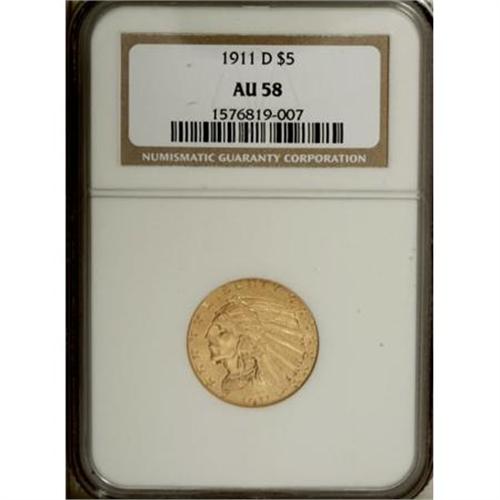 <B>1911-D $5 AU58 NGC.</B></I> Among Indian half eagles, only the 1909-O has a lower mintage than the 1911-D. As one might expect, the 1911-D is scarce in all grades. In Mint State, it is rarer than the famous 1929. The present near-Mint example has a clear mintmark and no obvious marks. Slightly glossy with faint highpoint wear on the portrait.<BR><BR><B>Coin Engraver:</B> Bela Lyon Pratt<BR><BR><b>Shipping:</b> Coins & Currency (<a target="_blank" href="http://www.heritageauctions.com/common/shipping.php">view shipping information</a>)