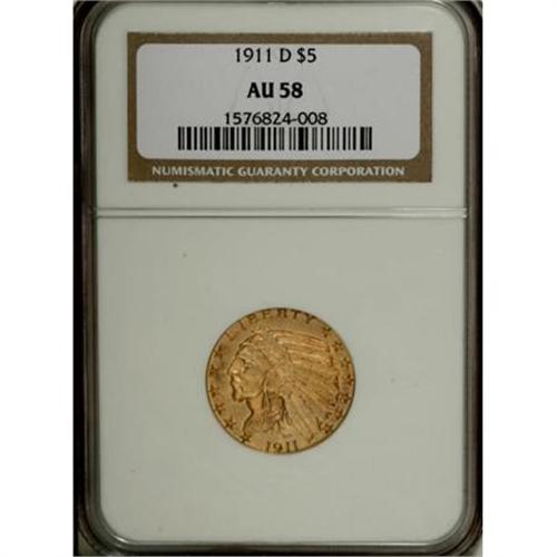 <B>1911-D $5 AU58 NGC.</B></I> Lustrous brass-gold surfaces are imbued with whispers of apricot and light green, and exhibit sharply impressed design elements. A couple of minor marks are noted on each side. The 1911-D half eagle is a scarce date from a low mintage of just 72,500 coins.<BR><BR><B>Coin Engraver:</B> Bela Lyon Pratt<BR><BR><b>Shipping:</b> Coins & Currency (<a target="_blank" href="http://www.heritageauctions.com/common/shipping.php">view shipping information</a>)
