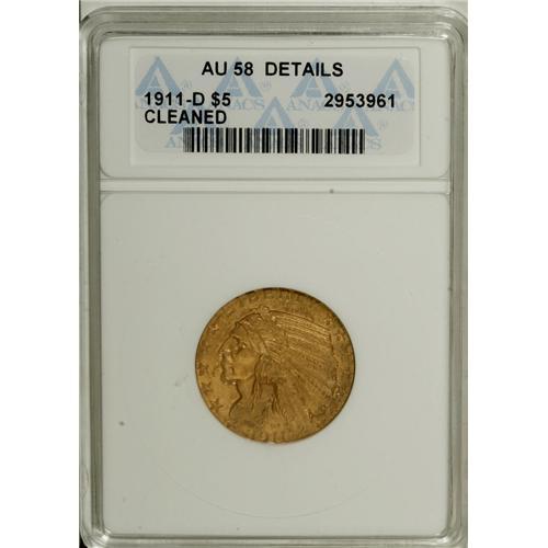 1911-D $5 --Cleaned--ANACS. AU58 Details. NGC Censu