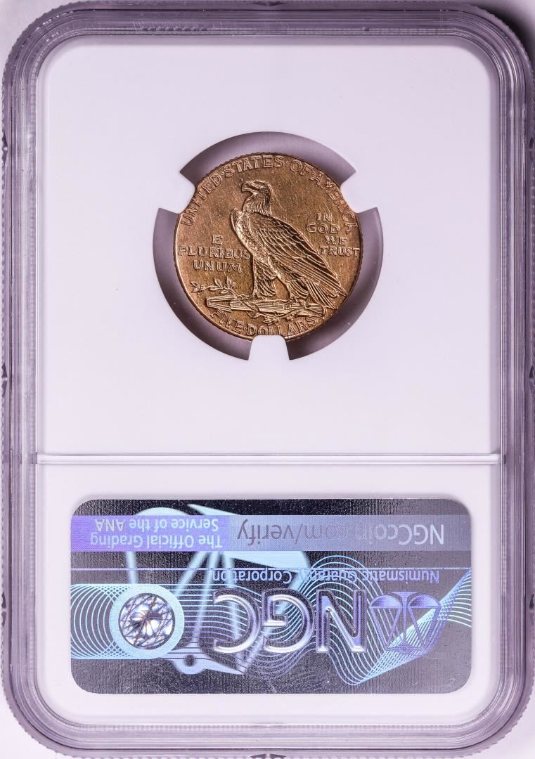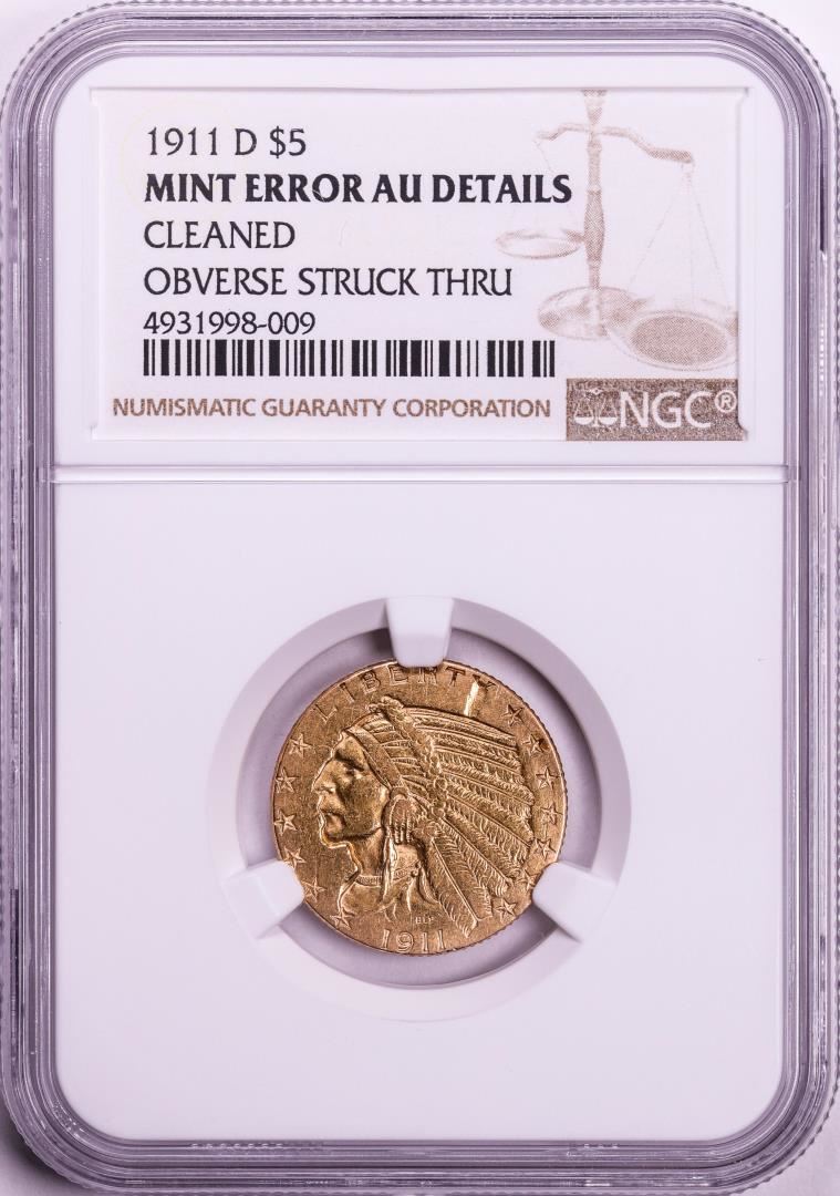 One 1911-D $5 Indian Head Half Eagle Gold Coin Obverse Struck Thru Error NGC AU Details. NGC Certified.