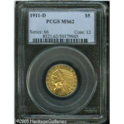 <B>1911-D $5 MS62 PCGS.</B></I> One of the key dates to this very popular series and always in strong demand as few are found in mint condition. This particular coin shows good luster, pleasing surfaces and the usual adequate strike. The mintmark and devices are clear. A nice coin for the date collector. Population: 36 in 62, 53 finer (1/05). Lot:8693
